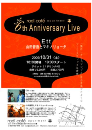 この11月でradi cafe apartmentはおかげさまでなんとなく、6周年! ありがとう!ありがとう!どもです!まいどです! 今回の6周年は、いっつもお世話になっている「山田晋吾とマキノリョータ」のお二人が「Ett」と対バンでお祝いしてくれます!「Ett」です…